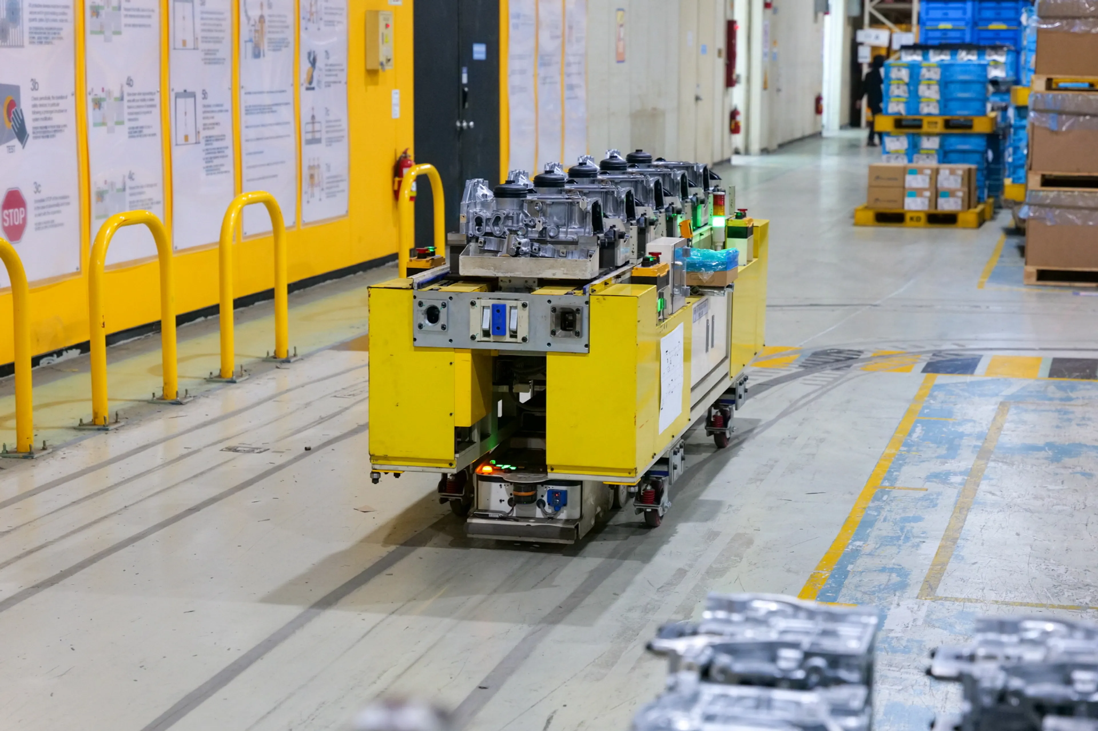 An autonomous mobile robot (AMR) that transports components throughout the plant, replacing forklifts and reducing the risk of accidents. Busan is the first Renault plant to use them; more than 500 AMRs will be deployed worldwide by 2027.